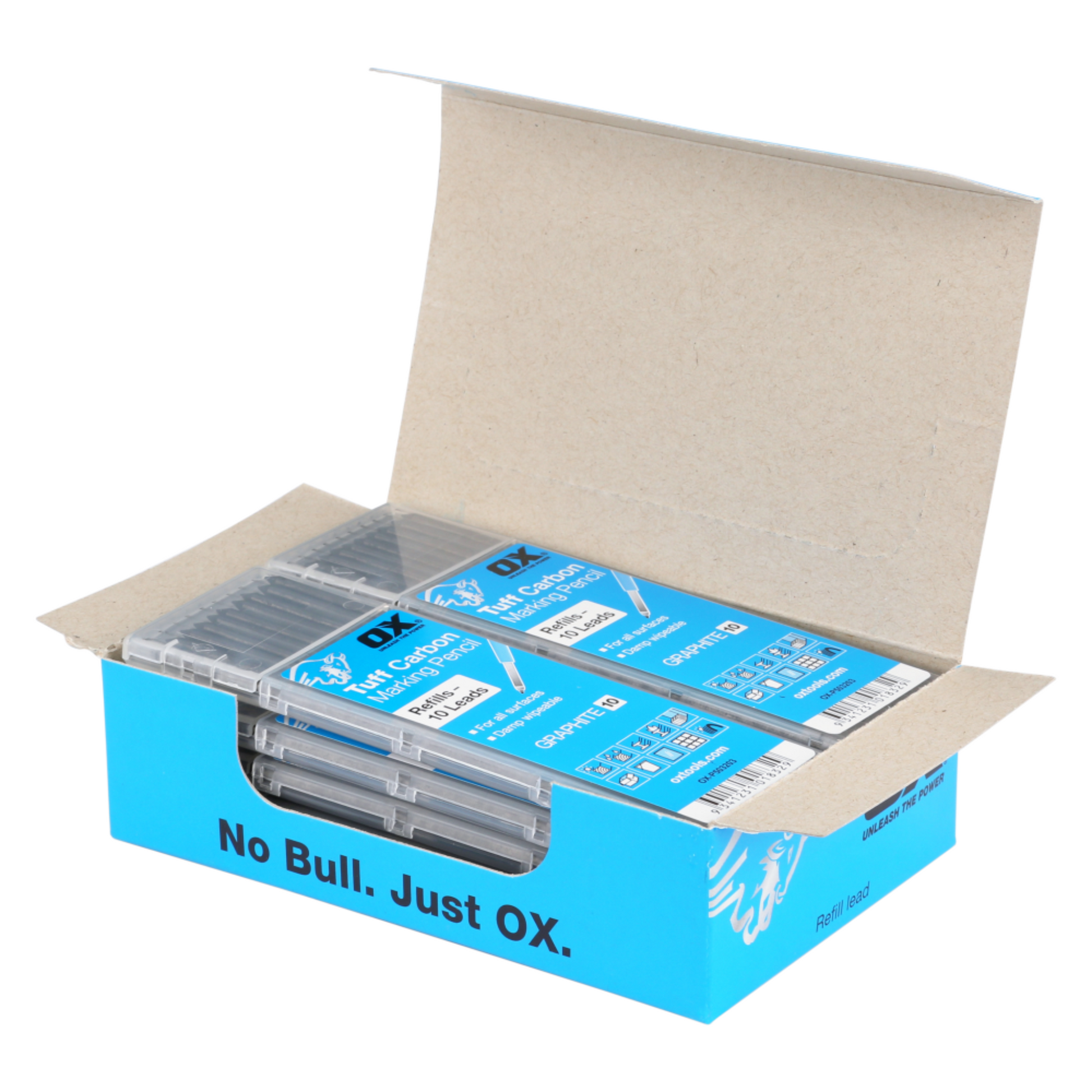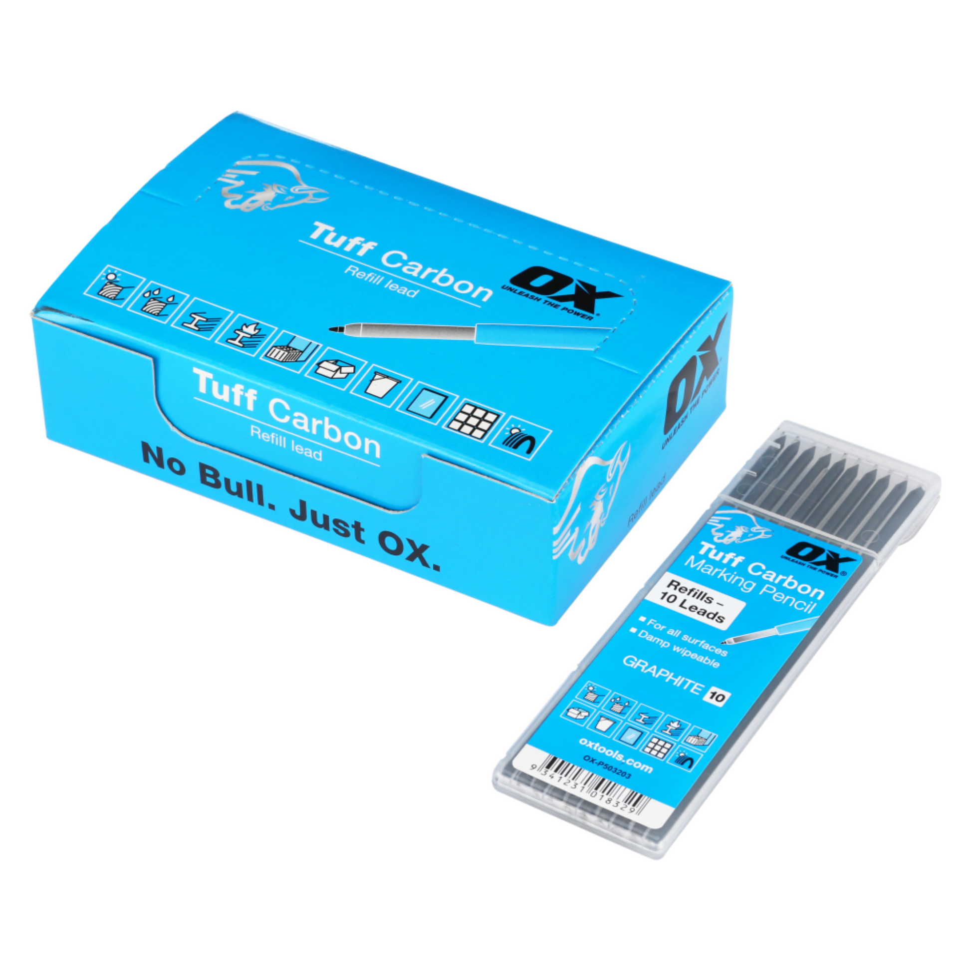 The OX Tuff Carbon Refills 10 Pack provides long-lasting 2.8mm graphite leads, specifically designed for use with the Tuff carbon pencil. These replacement leads allow for marking on diverse surfaces, whether wet or dry, ensuring versatile application in professional and trade environments. Featuring damp wipeable capabilities, they offer easy cleanup and efficient performance, making them ideal for carpentry, construction, and general marking tasks.